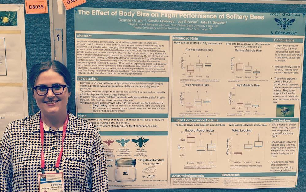 Courtney is a PhD student in Dr. Julia Bowsher’s lab studying two species of solitary bees, Megachile rotundata, alfalfa leafcutting bee and Osmia lignaria, blue orchard bee. Her expertise is in nutrition and development of solitary bees. Currently, she is working on determining how insect nutritional quantity affects rate of development and how telomeres function in these solitary bee species. Her favorite part of the job is to ask novel questions about her favorite insect, bees!