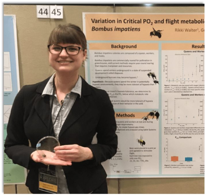 Rikki Walter is a graduate student at North Dakota State University. Her undergraduate research was on metabolic rate and critical oxygen partial pressure in bumble bees. Join Rikki and her colleagues on November 18th at the Entomological Society of America (ESA) conference in St. Louis, Missouri. Click here for conference details.