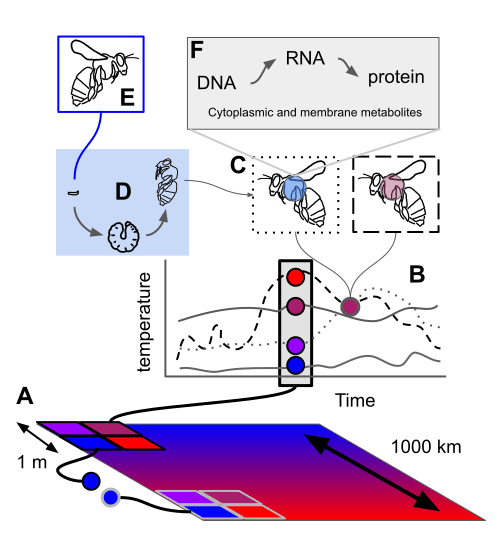 Advances in tools to gather environmental, phenotypic, and molecular data have accelerated our ability to detect abiotic drivers of variation across the genome-to-phenome spectrum in model and non-model insects. However, differences in the spatial and temporal resolution of these data sets may create gaps in our understanding of linkages between environment, genotype, and phenotype that yield missed or misleading results about adaptive variation. In this review we highlight sources of variability that might impact studies of phenotypic and ‘omic environmental adaptation, challenges to collecting data at relevant scales, and possible solutions that link intensive fine-scale reductionist studies of mechanisms to large-scale biogeographic patterns.