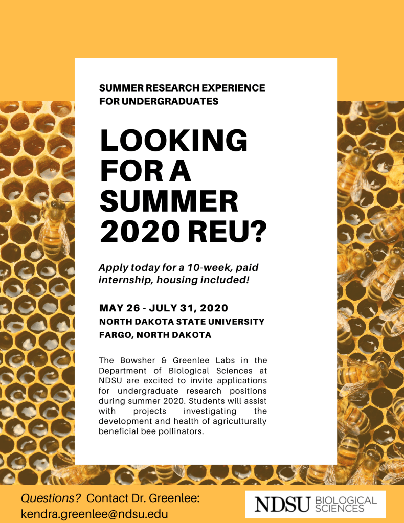 The Bowsher and Greenlee Labs in the Department of Biological Sciences are excited to invite applications for undergraduate research positions during summer 2020. Students will assist with projects investigating the development and health of agriculturally-beneficial bee pollinators (blue orchard mason bees, Osmia lignaria; alfalfa leafcutting bees, Megachile rotundata; and honey bees, Apis mellifera).